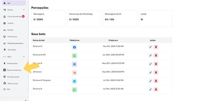 Faça login na sua conta da Etherna IA e acesse o dashboard principal.
